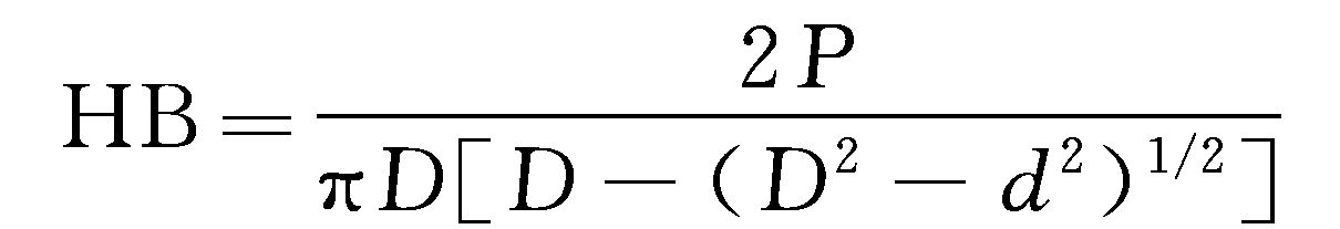 式中,HB为布氏硬度,Pa;P为所施加的负荷,N;D为钢球直径,m;d为压痕直径,m;h为压痕深度,m。测定布氏硬度较准确可靠,但一般适用于较软的金属材料。