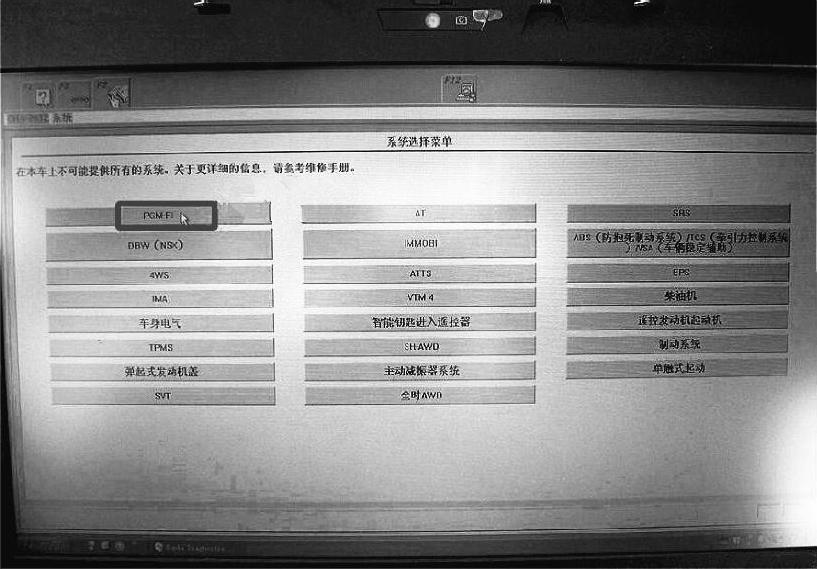 5)系统选择菜单,如图1-19所示。该界面显示可从中选择车辆系统的一连串按钮,如PGM-FI、AT等,选择适合的车辆诊断系统。要选择系统,可使用鼠标双击所需的按钮,或者单击按钮并按下随后显示在界面右下角的回车按钮。这会使诊断系统突出显示模式菜单界面。