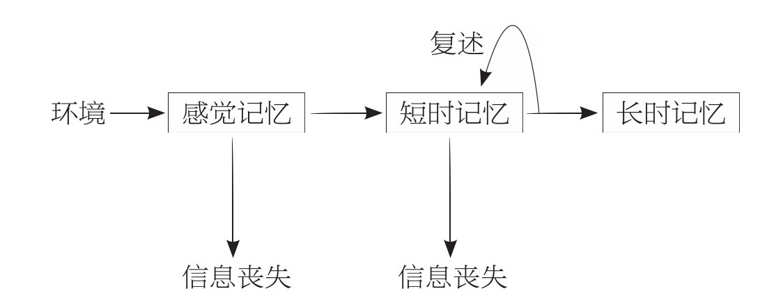 记忆是心理学中研究最多的一个领域。20世纪50年代中期以后,许多心理学家用信息加工的观点来解释记忆。根据记忆过程中,从信息输入到提取所经过的时间间隔不同,编码的方式不同,一般把记忆分为三种系统或称三个阶段,即感觉记忆、短时记忆和长时记忆。如图: