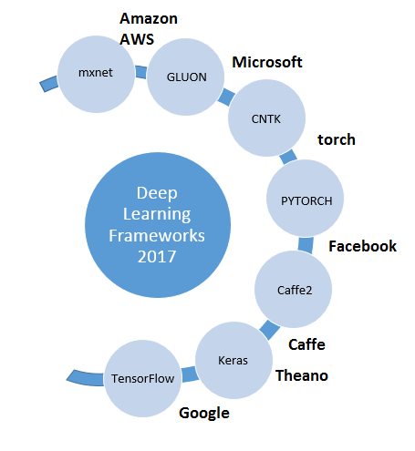 We will mainly be working with the two most popular deep learning frameworks that exist, and are freely available to the public at large. This does not mean that we will completely limit our implementations and exercises to these two platforms. It may well occur that we experiment with other prominent deep learning frameworks and backends. We will, however, try to use either TensorFlow or Keras, due to their widespread popularity, large support community, and flexibility in interfacing with other prominent backend and frontend frameworks (such as Theano, Caffe, or Node.js, respectively). We will now provide a little background information on Keras and TensorFlow: