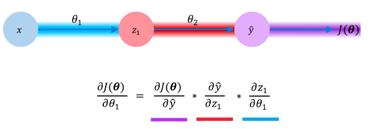 As if this wasn't complicated enough, we can even take this recursion further. Let's say that instead of modeling the impact of the changing weights of the second layer (θ2), we wanted to propagate all the way back and see how our loss changes with respect to the weights of our first layer. We then simply redefine this equation using the chain rule, as we did earlier. Again, we are interested in the change in our model's loss with respect to the model weights for our first layer, (θ1). We define this using the product of three different gradients; the changes in our loss with respect to output, changes in our output with respect to our hidden layer value, and finally, the changes in our hidden layer value with respect to our first layer weights. We can summarize this as follows:
