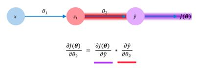 What if we wanted to see how changes in the weights of the second layer impact the changes in our loss? Obeying the rules of calculus, we can simply differentiate our loss function, J(θ), with respect to the weights of the second layer (θ2). Mathematically, we can actually represent this in a different manner as well. Using the chain rule, we can show how changes in our loss with respect to the second layer weights are actually a product of two different gradients themselves. One represents the changes in our losses with respect to the model's prediction, and the other shows the changes in our model's prediction with respect to the weights in the second layer. This may be represented as follows: