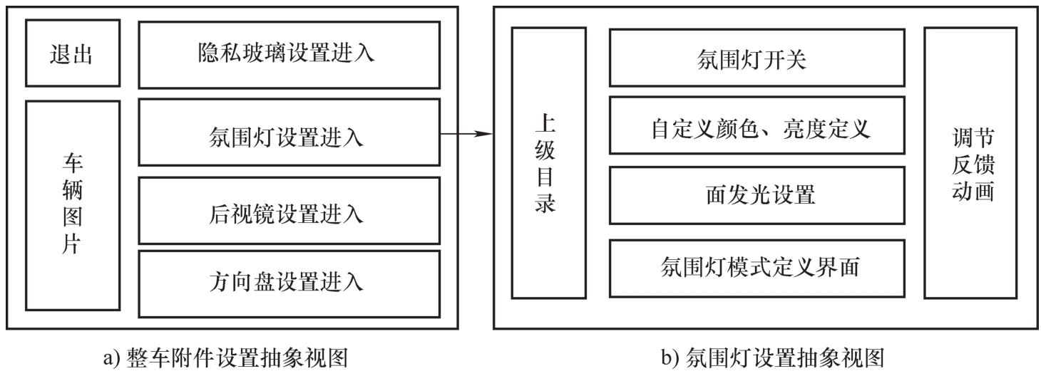 抽象视图都是相对独立的视图,相互之间没有逻辑关系。关联性设计就是构建这些抽象视图之间的逻辑关系,以实现完整的用户功能。任何人机系统图形用户界面都包含若干视图状态,用户根据不同任务目标,切换到相应视图下进行操作。因此,根据用户的操作需求,对视图进行合理的关联设计是必要的。以氛围灯视图关联性设计为例,氛围灯属于整车附件设置版块,需将氛围灯抽象视图与整车附件设置抽象视图关联,并在此视图上设计氛围灯开关按钮,通过点击进入氛围灯设置视图,如图3-13所示。