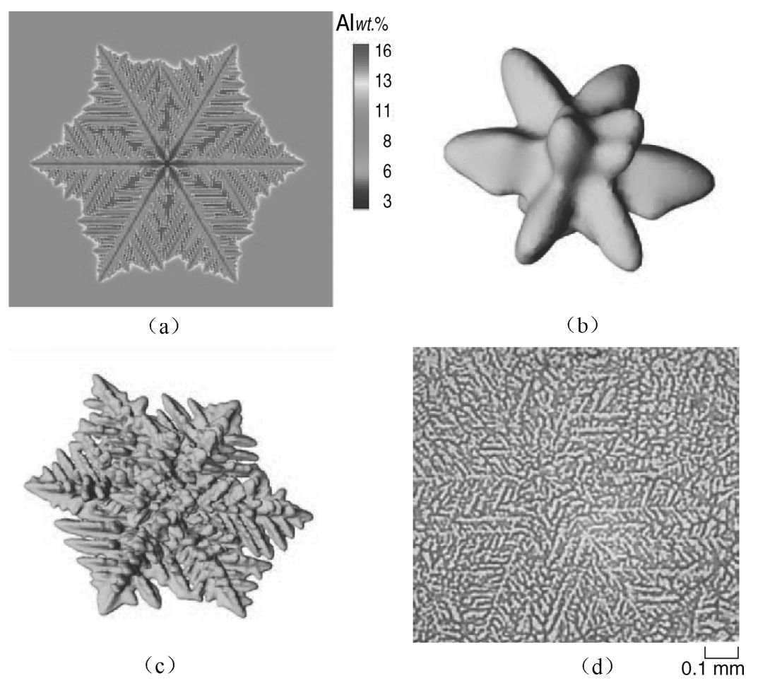 Fig. 2 (a,b,c) Simulated and (d) experimental results of Mg alloy dendrites. (a) simulated 2-D equiaxed dendrite; (b) simulated 3-D equiaxed dendrite at early stage; (c) fully developed 3-D equiaxed dendrite; (d) metallographic results showing texture of Mg alloy dendrites.