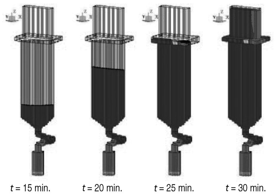 The simulation was carried out for a large 300-t steel ingot (Fe-0.36wt.%C) 4.5 m in height and 3.4 m in mean width. Teeming was ignored, and no superheat was considered for the molten steel. The schematic of MP process is shown in the left side of Figure 14, showing that the first ladre contains 150-t molten steel, the second 90-t and the third 60-t, while the final macrosegregation pattern of carbon in the right side of Figure 14.