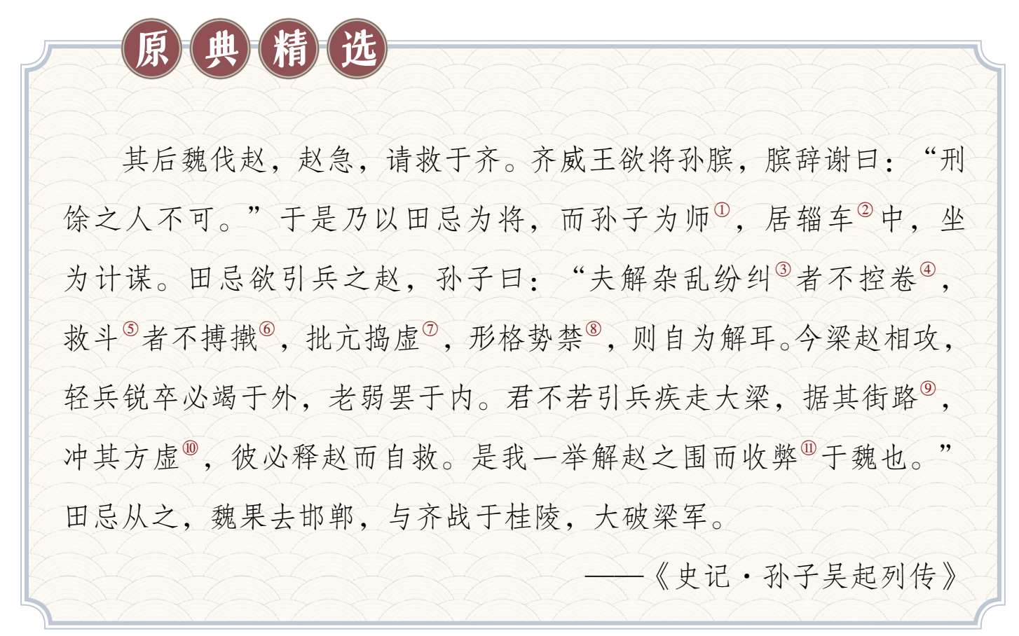 后来魏国出兵征讨赵国,赵国形势危急,派人向齐国求救。齐威王想让孙膑担任将军,孙膑推辞说:“遭受过刑罚的残疾人不能够担任将军。”于是齐威王才让田忌担任将军,而让孙膑担任军师,乘坐在带有篷盖的马车中,坐着为田忌出谋划策。田忌打算带领士兵直接救助赵国,孙膑说:“拆解乱丝乱麻之类的东西不必用手胡乱地掰扯,拉架的人不会直接用拳头将人分开,如果避实就虚的话,形势就会转变,那么所有的难题将迎刃而解。现在魏国和赵国激战正酣,魏国的精兵良将一定全部在国外,只剩老弱的士兵留在国内。您不如领兵直接进攻大梁,占据魏国的交通要道,攻击其兵力空虚的地方,魏军必定离开赵国而回国自救。这样的话我们就可以解除赵国的围困,征服魏国疲惫的军队。”田忌听从孙膑的建议,魏军果然离开邯郸,和齐军在桂陵决战,齐军大胜魏军。