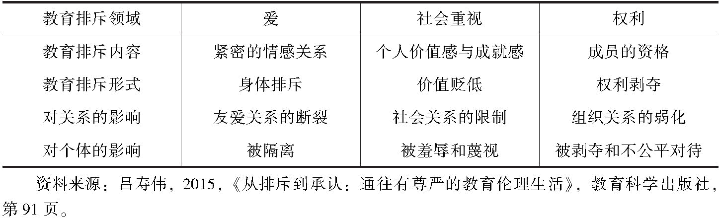 吕寿伟认为教育排斥是可以认识的,它有着自身的表现形式及实施的方式,通常通过身体疏离、价值贬低和权利剥夺三种形式剥夺处于弱势的学生作为教育共同体的资格,使他们不能有效和充分地参与到教育生活中,在教育生活中一直处于边缘化的处境(吕寿伟,2015),如表1所示。