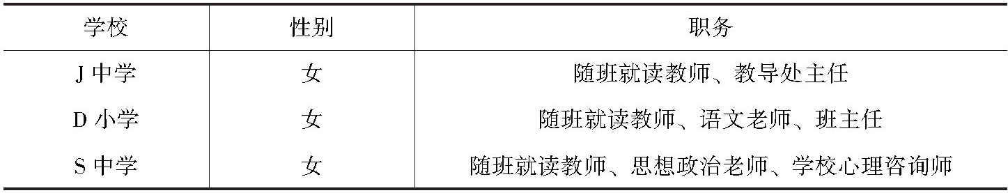 笔者从2015年10月至2016年10月在上海市H区特殊教育康复指导中心实习,主要到H区的各中小学为随班就读学生提供个训课服务和心理辅导服务,另外通过特教中心与H区的D小学进行链接,笔者可以对该学校的一位随班就读儿童进行一学期的课堂陪读。通过这些机会,笔者接触到许多随班就读儿童、普校的随班就读教师、随班就读儿童家长。鉴于此,笔者对随班就读儿童的情况有着相对深入的了解,根据研究的具体需要,本研究一共选择了3所中小学的8名随班就读儿童、3名普校的随班就读教师和2名随班就读儿童家长,具体被访者资料如表2、表3和表4所示。