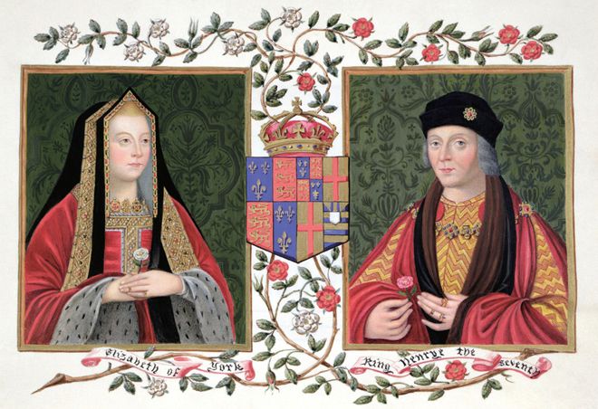 亨利七世于1486年迎娶爱德华四世之女约克的伊丽莎白,将兰开斯特与约克这两个相互厮杀的家族联合起来。图画中亨利七世手持象征兰开斯特家族的红玫瑰,伊丽莎白则手持象征约克家族的白玫瑰,装饰性的红白两色玫瑰枝条缠绕在一起托着王冠。