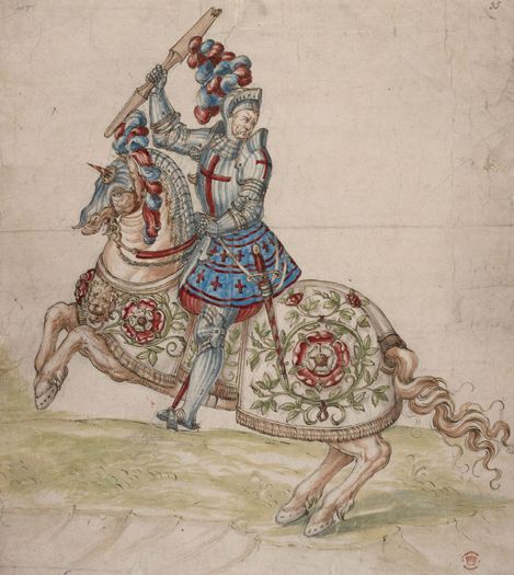 骑在战马上的骑士身着蓝色和深红色的衣服,胯下战马披挂的布上装饰着典型的都铎玫瑰。