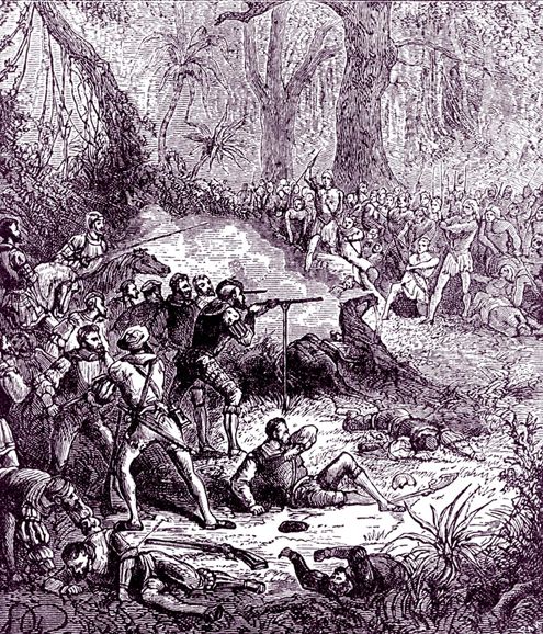 骑着马、举着火绳枪的西班牙人与印第安勇士在安蒂苏尤的丛林地区交战。(LIBRARY OF CONGRESS)