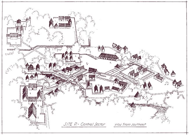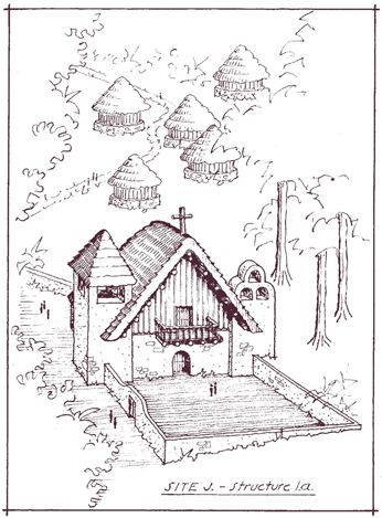 建筑师文森特·李创作的瓦兰卡拉布道点细节图,这个布道点是由奥古斯丁修会修士迭戈·奥尔蒂斯建立的。李根据自己发现的建筑遗迹画出了这幅图。根据西班牙编年史作者的说法,奥尔蒂斯修士在成为殉道者之前在这里做了最后一场弥撒。教堂后面的圆形建筑可能是亚马孙印第安人的住所。(文森特·李)