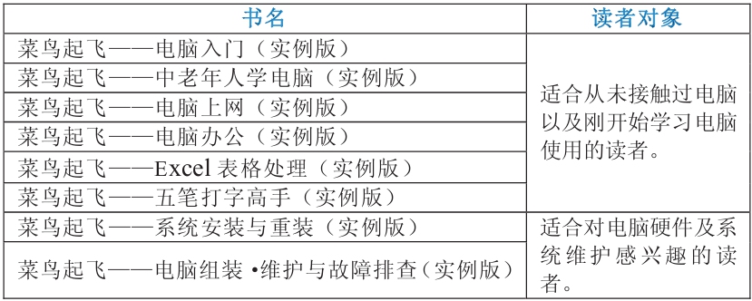 本系列图书主要针对从未接触过电脑以及刚开始学习电脑的读者。无论是希望全面学习电脑应用或某项专业技能的学生,还是公司职员、公务员、家庭用户以及中老年朋友,都能在本系列图书中找到适合您的选择。本系列丛书主要书目如下。
