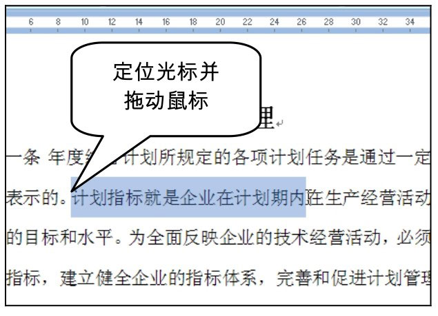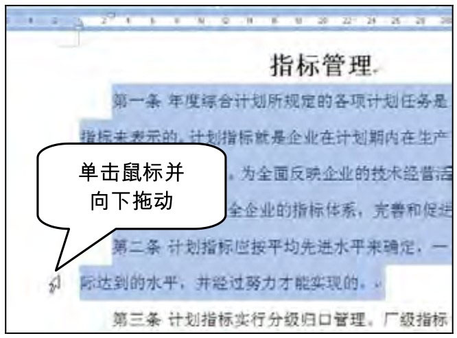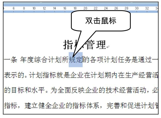 选定单个文字:打开实例文件\第2章\原始文件\指标管理.docx文件,如果需要选择单个文字,则将光标定位在需要选定单字的左侧或者右侧,再按下鼠标左键向右或者向左进行拖动,拖动鼠标经过所需要的目标文字时释放鼠标,即可看到目标文字为选中状态并以高亮显示,效果如图2-20所示。