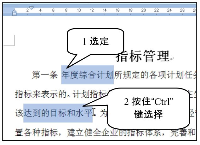 选定多个不相连的文字:如果需要选定不相连的多个文字,则选择一处文字之后,按住键盘中的“Ctrl”键再选择其他文本,即可同时选定多个不相连的文字,如图2-23所示。