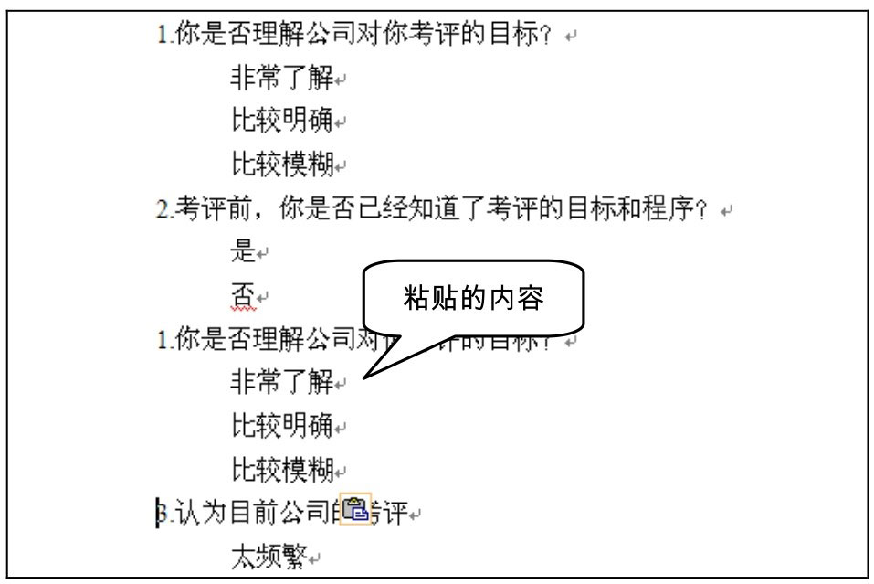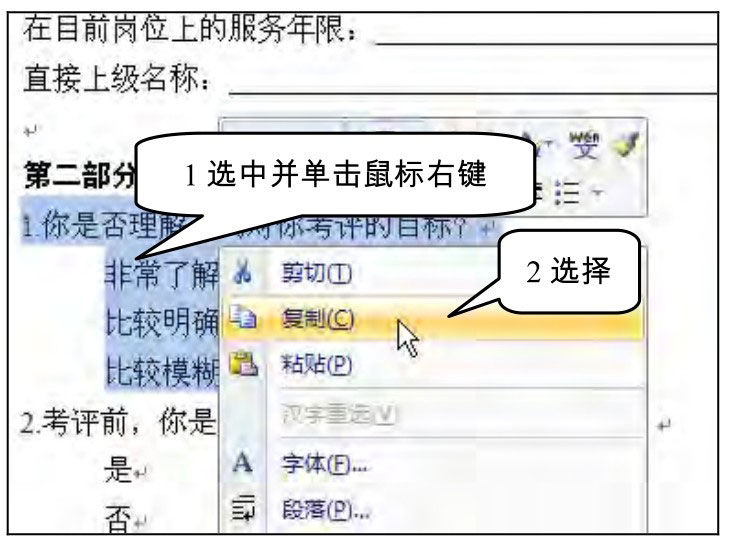 Step1 复制文本。打开实例文件\第2章\原始文件\员工考评意见调查.docx文件,首先选中需要复制的文本,比如在此选中文档内容的第二部分中的第一个问题及选项内容文本并单击鼠标右键,在弹出的快捷菜单中选择“复制”命令,如图2-32所示。