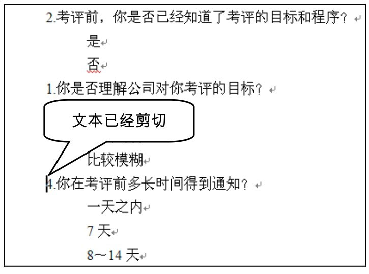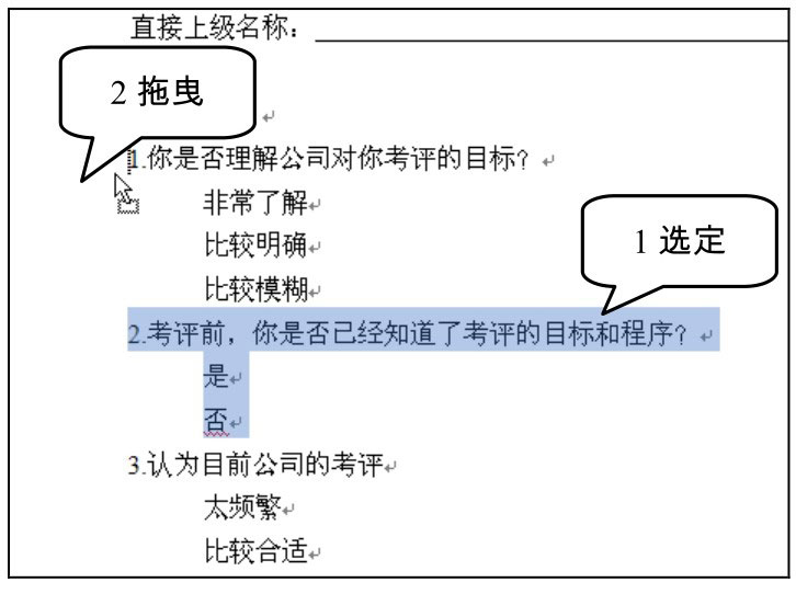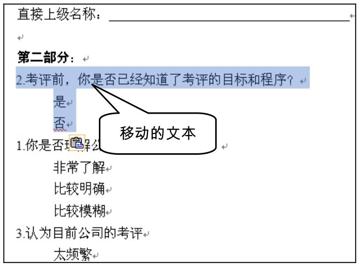 Step1 移动文本。打开实例文件\第2章\原始文件\员工考评意见调查.docx文件,选中所需要移动的文本,比如在此选定文档第二部分中的第二个问题及答案选项,将指针移至所选择内容的任意位置,当指针呈白色向左的箭头形状时按住鼠标左键不放并进行拖动,如图2-35所示。