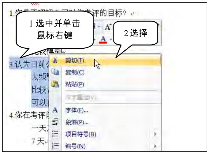 Step3 剪切文本。选中文档中的第3个问题及答案选项并单击鼠标右键,在弹出的快捷菜单中选择“剪切”命令,如图2-37所示。