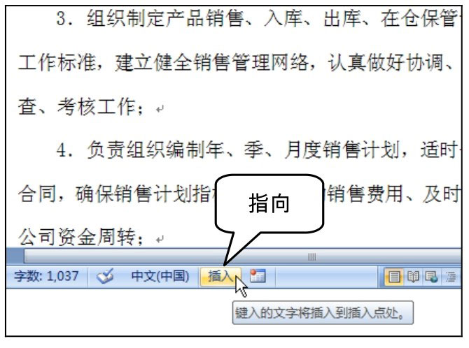 Step1 确认插入状态。打开实例文件\第2章\原始文件\工作分析.docx文件,在状态栏中可以看到当前的编号状态为“插入”,即输入的文字将插入到插入点处。指向“插入”按钮时,将显示当前编写状态的提示信息,如图2-41所示。