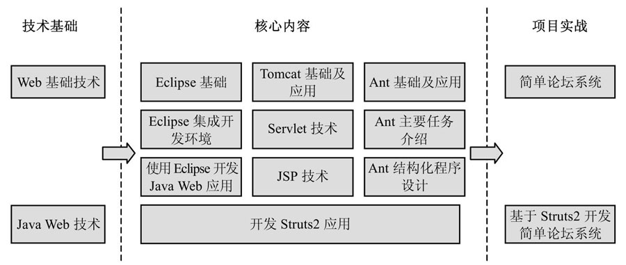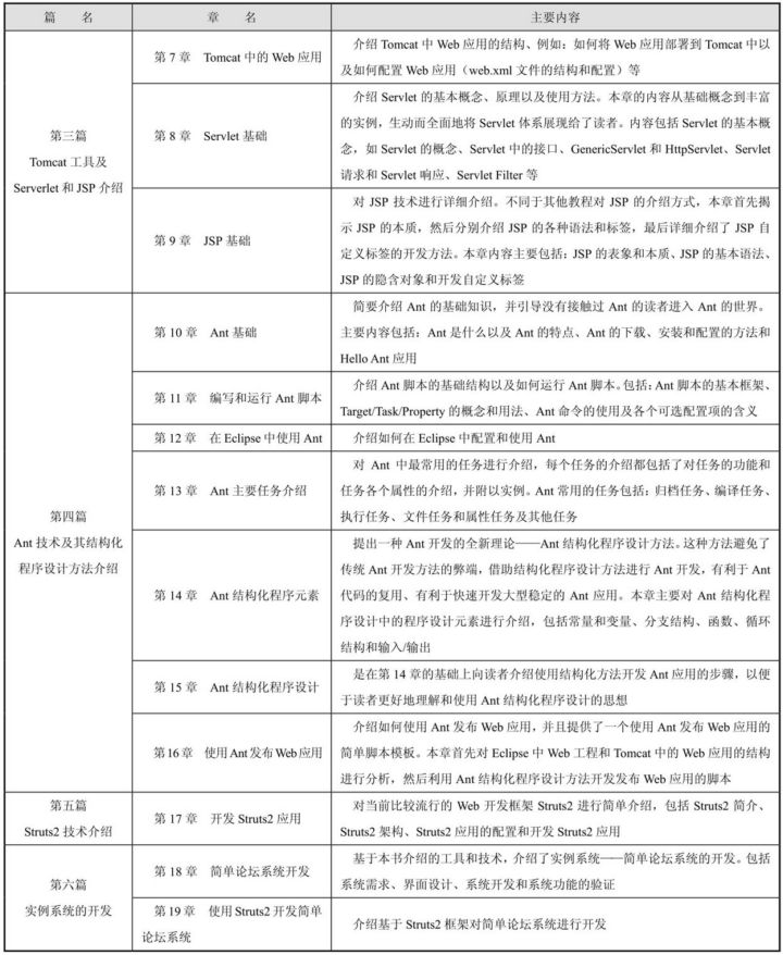 本书从Web开发的基础网络技术谈起,第一篇为基础知识,分别介绍了Web基础技术和Java Web开发基础技术。第二篇介绍了Eclipse的相关知识,具体包括:Eclipse基础、Eclipse集成开发环境以及如何使用Eclipse开发Java Web应用;第三篇介绍了Tomcat工具以及Servlet和JSP技术,具体包括:Tomcat基础、Tomcat中的Web应用、Servlet技术和JSP技术;第四篇介绍了Ant的基础知识以及Ant结构化程序设计理论,具体包括:Ant基础、编写和运行Ant脚本、在Eclipse中使用Ant、Ant主要任务、Ant结构化程序设计元素、Ant结构化程序设计、使用Ant发布Web应用;第五篇介绍了当前最流行的一种Java Web开发框架——Struts2。最后,第六篇通过使用两种不同的技术实现一个简单论坛系统,将本书介绍的技术串联起来给读者一个Java Web开发的全景图。