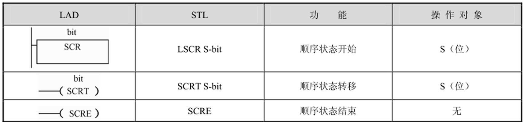 ① 装载顺序控制指令“LSCR S-bit”用来表示一个SCR段(顺序功能图中的步)的开始。指令中的操作数S-bit顺序控制继电器“S”的位地址。顺序控制继电器为“1”状态时,执行对应的SCR段中的程序;反之,不执行。