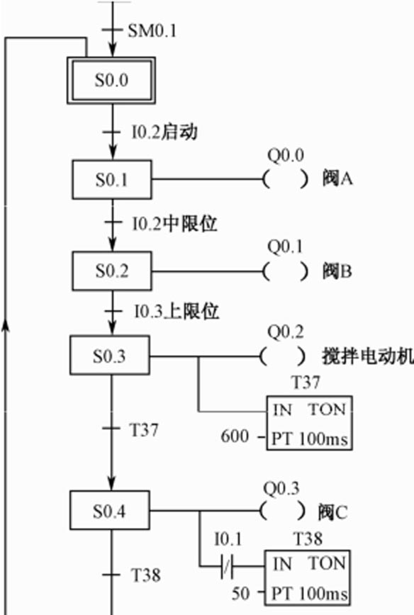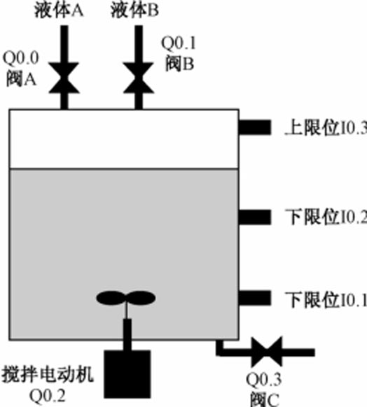 液体混合装置的结构如图4-8所示,上限位、中限位和下限位液位传感器被液体淹没时为ON,电磁阀A、B和C的线圈通电时打开,线圈断电时关闭。初始状态时容器是空的,各阀门均关闭,各传感器均为OFF。按下启动按钮后,打开阀A,液体A流入容器,当中限位传感开关I0.2变为ON时,关闭阀A,打开阀B,液体B流入容器。液面到达上限位时,关闭阀B,搅拌电动机开始运行,搅拌液体,60s后停止搅伴,打开阀C,放出混合液,液面降至下限位开关之后再过5s,容器放空,关闭阀C,完成混合工作。