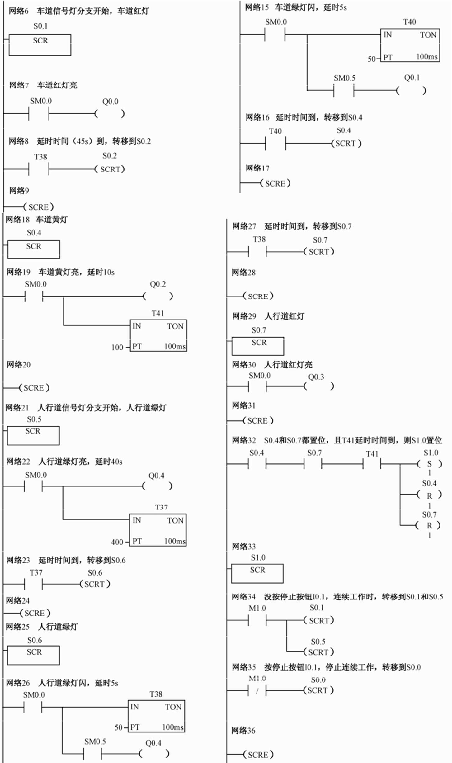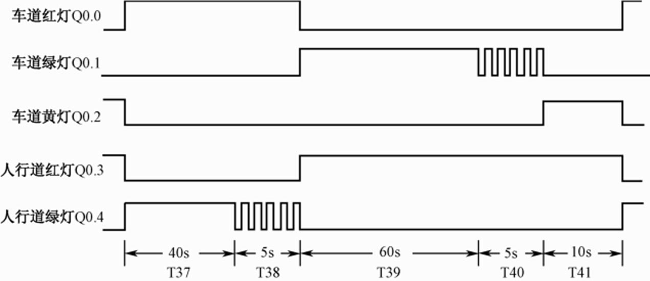 (6)按下启动按钮SB1,车道红灯和人行道绿灯亮,40s后人行道绿灯闪烁,5s后车道红灯和人行道绿灯熄灭,人行道红灯和车道绿灯亮,60s后车道绿灯闪烁5s熄灭,车道黄灯亮,10s后人行道红灯和车道黄灯熄灭:
