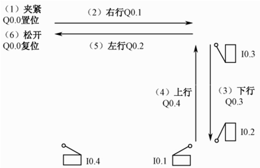 5.冲床的运动示意图如图4-25所示,初始状态时机械手在最左边,I0.4为ON;冲头在最上面,I0.3为ON;机械手松开(Q0.0为OFF)。按下启动按钮I0.0,Q0.0变为ON,工件被夹紧并保持,2s后Q0.1变为ON,机械手右行,直到碰到右限位开关I0.1,以后将顺序完成以下动作;冲关下行,冲头上行,机械手左行,机械手松开(Q0.0被复位),系统返回初始状态,各限位开关和定时器提供的信号慢相应步之前的转换条件。画出控制系统的顺序功能图。