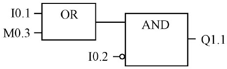 功能块图用类似与门、或门的方框来表示逻辑运算关系,方框的左侧为逻辑运算的输入变量,右侧为输出变量,输入/输出端的小圆圈表示“非”运算,方框被“导线”连接在一起,信号自左向右流动,如图2-3所示。