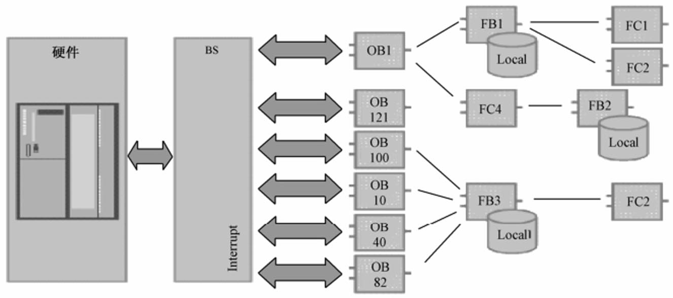 STEP7编程采用块的概念,即将程序分解为独立的、自成体系的各个部件,块类似于子程序的功能,但类型更多、功能更强大。从块的功能、结构及应用角度来看可将其分为用户块和系统块两类。用户块包括组织块(OB)、功能块(FB)、功能(FC)及数据块(DB),系统块包括系统功能块(SFB)、系统功能(SFC)和系统数据块(SDB)。S7-300/400程序结构图如图2-5所示。