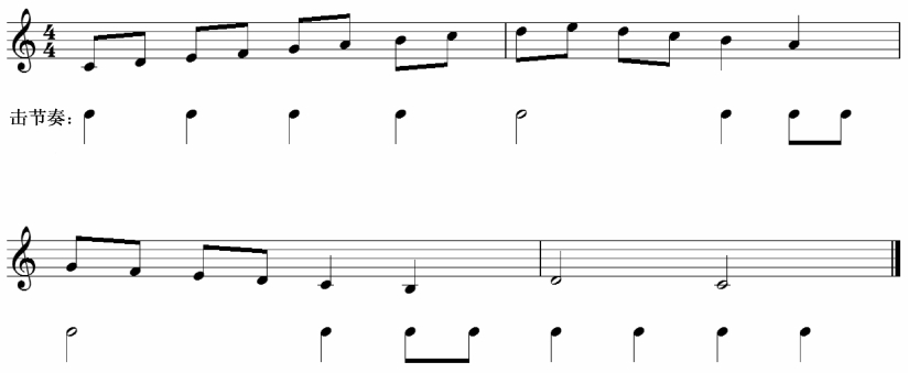(2)“∨”为一拍记号。学生应从现在起,练习时长的同时,养成必须打拍子的良好习惯(先击拍,待能较熟练并准确地掌握拍子快慢的规律后,再打拍子)。