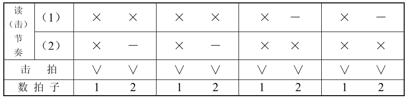 每个人(组)从以下(1)、(2)两行节奏中任选两组同时进行“读”(用da读节奏)、“击”(用手击拍)或“击”、“数”(用嘴数拍子)两种方式的练习。熟练后,可以从这8个格子中任选几个格子组成节奏练习。