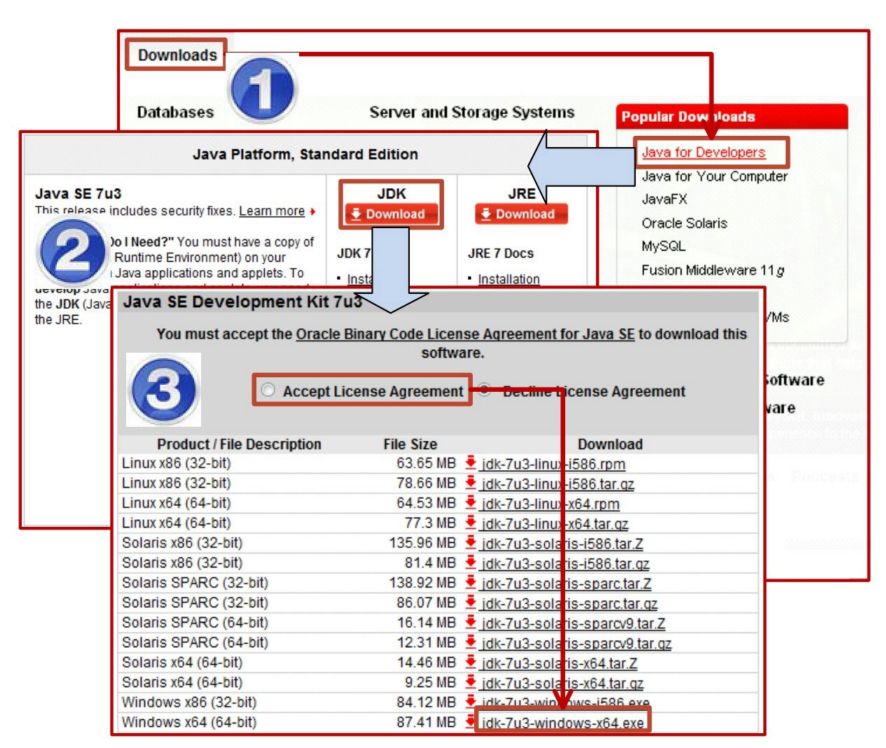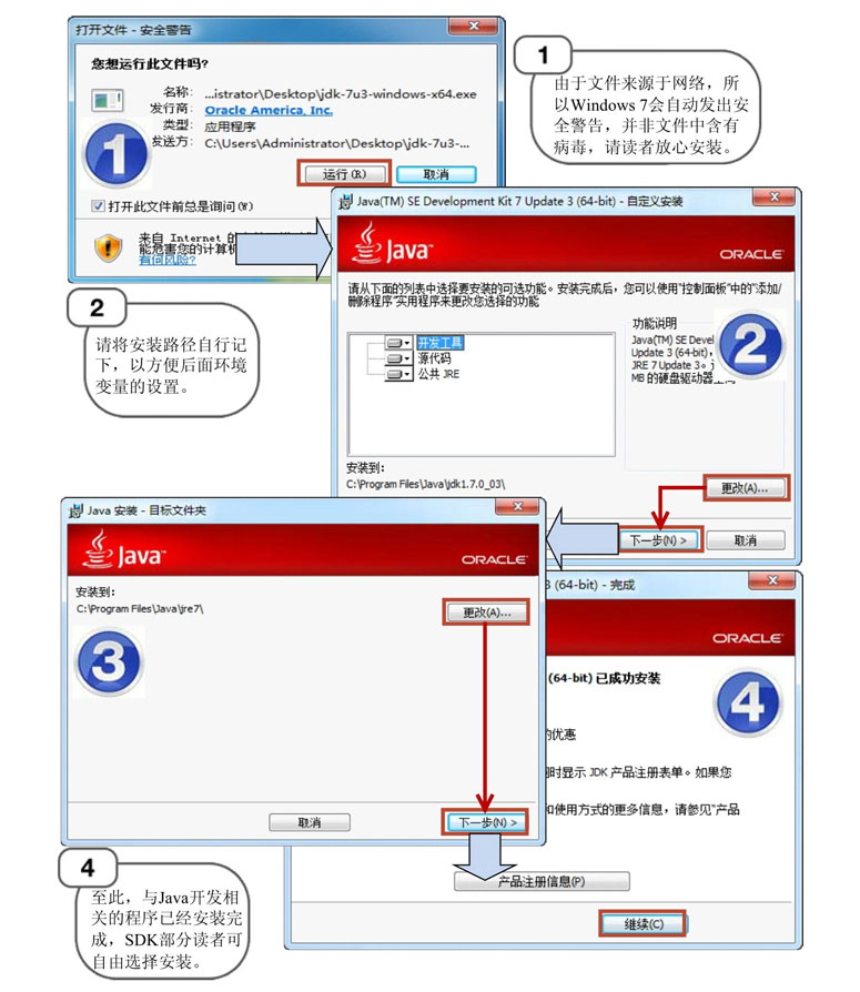 下载完成后,便可开始安装JDK。双击jdk-7u3-windows-x64.exe开始安装,具体安装流程如图1.5所示。