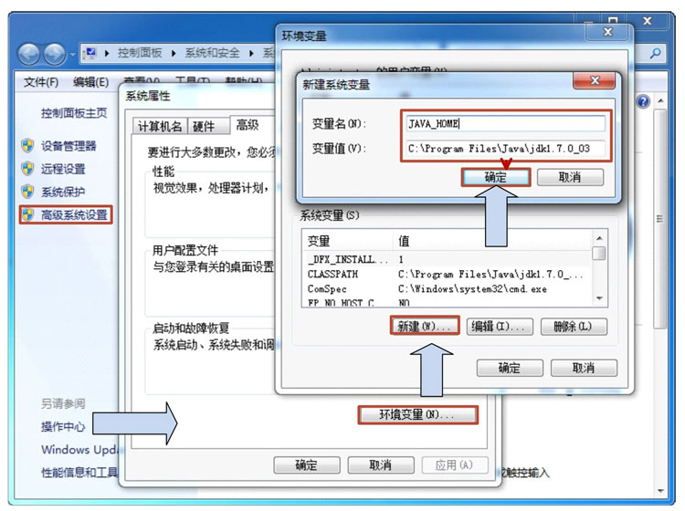 JDK安装完成后,需要进行环境变量的设置。环境变量是包含了关于系统及当前登录用户的环境信息的字符串,有些程序使用此信息确定在何处放置和搜索文件。和JDK相关的环境变量有两个:JAVA_HOME和CLASSPATH。由于其功能是确定文件位置,所以其变量值为JDK的安装路径。其具体的配置方法是:右击“计算机”图标,选择“属性”命令,出现系统对话框,接下来的具体步骤如图1.6所示。