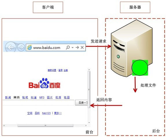 其中,客户端可以是用户使用的计算机,也可以是手机。而服务器是管理网站资源并为用户提供服务的计算机软件,也可以称为后台。当接收到客户端发送过来的请求时,服务器会找到相应的文件用相应技术进行解析,将解析成的HTML代码返回给客户端。而客户端呈现出来的网页内容称为前台。