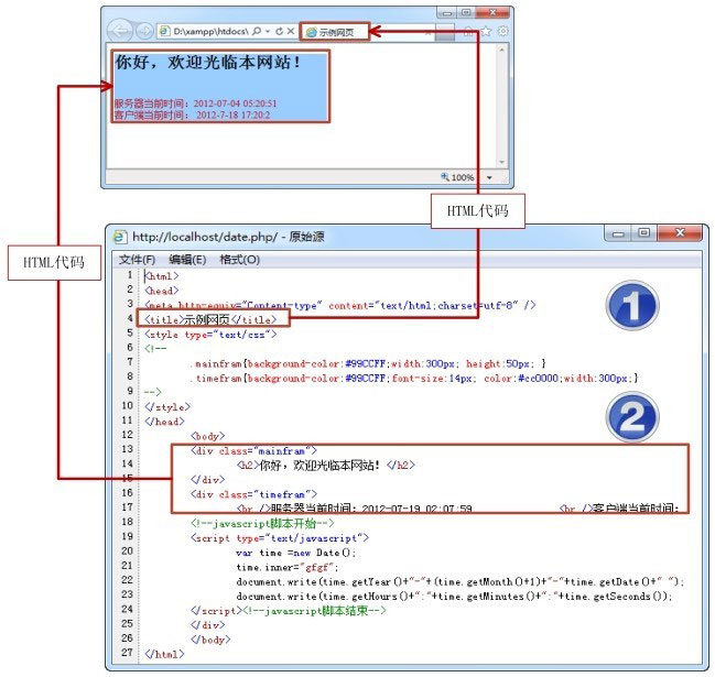 图1.5的date.php文件用于获取服务器的当前时间,然后服务器把date.php文件中的PHP代码解析成HTML代码发送到客户端,由客户端解析显示出来。