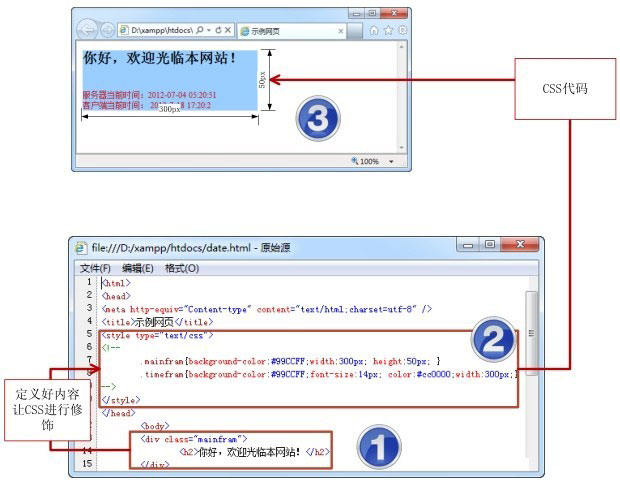 CSS的英文全称是Cascading Style Sheets,中文含义即“层叠样式表”。它的作用是对网页上的内容进行控制修饰。这里仍以【示例1-1】为例,讲解CSS在其中所发挥的作用,如图1.3所示。