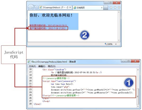 图1.4就是将JavaScript代码直接嵌入到HTML中,要显示客户端的当前时间,所以直接获取当前的时间,由浏览器解析显示在页面中。