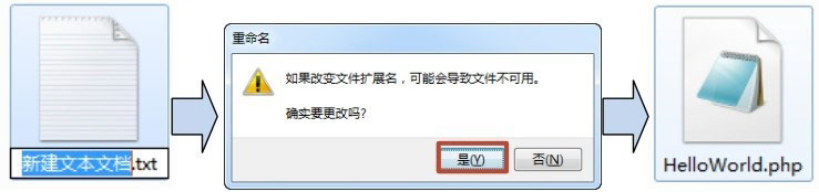 接下来需要找到XAMPP安装的位置,找到xampp/htdocs这个目录,这个目录是XAMPP默认情况下服务器读取的默认路径(当然可以改变这个路径),在这个目录下新建一个文本文档,然后将其重命名为HelloWorld.php。期间会发出重命名的警告,单击“是”按钮,如图1.12所示。