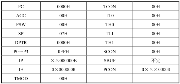 复位是单片机系统的初始化操作,系统复位后会对专用寄存器和单片机的个别引脚信号产生影响,复位后对一些专用寄存器的影响情况如表2.1所示。