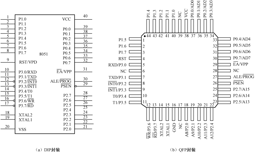 标准8051单片机有几种不同的封装形式。如图2.2(a)所示为DIP封装的引脚排列,图2.2(b)所示为QFP封装的引脚排列。
