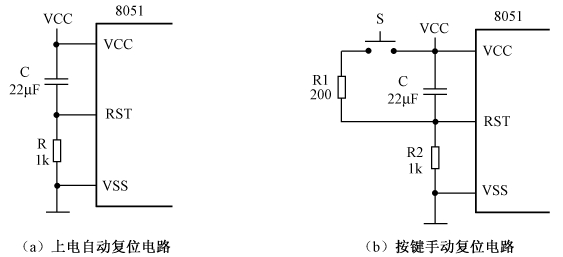 上电自动复位是通过外部复位电路的电容充电来实现的,该电路通过电容充电在RST引脚上加了一个高电平,高电平的持续时间取决于RC电路的参数。上电自动复位电路如图2.3(a)所示。