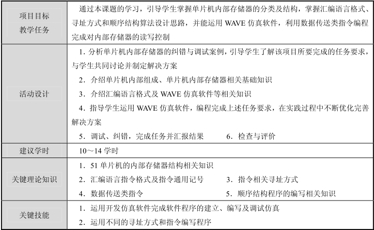 本项目的要求是利用单片机内部存储器进行数据的读写操作。要求我们掌握8051单片机内部存储器的分类和结构,掌握项目软件系统开发相关知识,包括:汇编语言的格式、指令通用记号和指令相关寻址方式,进而学会可以进行读写控制的数据传送类指令,通过WAVE仿真软件的相应窗口完成项目要求的任务内容。