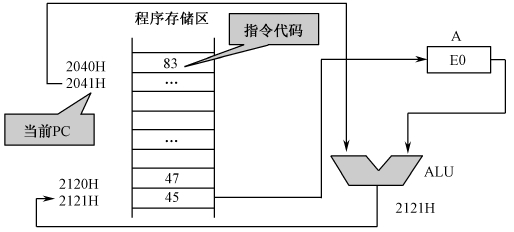 解:该指令以PC内容加1后的当前值作为基址寄存器,累加器A为变址寄存器(8位无符号整数),两者内容相加得到一个16位地址,将该地址对应的程序存储器单元的内容送给累加器A。所以上面指令的操作是将程序存储器1039H单元的内容送给累加器A。
