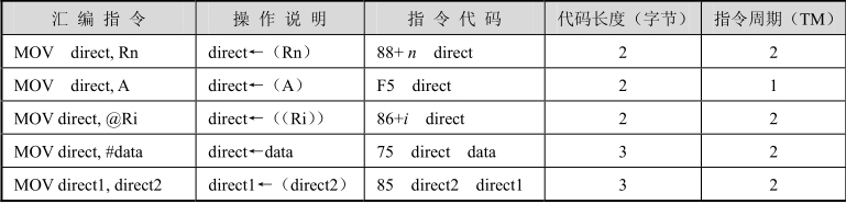 该组指令的功能是将源操作数的内容送入直接地址所指的存储单元。源操作数有寄存器寻址、直接寻址、寄存器间接寻址和立即寻址方式。