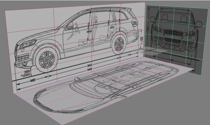 绘制草图就是将构思先简单地表现出来,当然也不是一定要这样,如果只是制作一些简单的内容,那么只需要在头脑中形成大致的轮廓就可以了,可如果要完成一些较大的、需要多人合作的项目例如飞机、汽车等工业产品,那么就必须绘制完整的产品结构图,有产品结构图才能确保产品模型的精确性。如图0-16所示是根据汽车的构思绘制的完整的产品结构三视图。