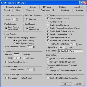 在菜单栏中选择“Customize(自定义)”→“Preference Setting(首选项设置)”命令可以打开如图0-38所示的对话框,在这里可以对3ds Max的一些基本的属性进行设置,包括文件、视口、插件等。