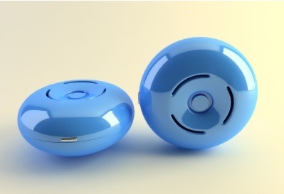 从二维设计参考图中可以看出该案例中的空气清新器是一个比较圆滑的造型,类似于圆柱体对象,只是在两端的边缘上要更加圆滑,并且顶端的中心部位呈向下凹陷状态。因此可以圆柱体为基本形态进行编辑。顶端的三个出气口结构可以通过执行ShapeMerge(图形合并)命令在对象上投影出气口的轮廓,然后再进一步调整。将空气清新器表现为三维造型的最终效果,如图1-2所示。