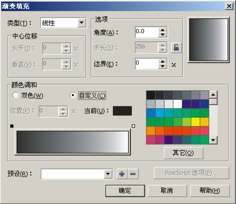 “交互式填充工具”下拉按钮,在弹出的下拉按钮中选择“渐变填充”选项,打开“渐变填充”对话框。在“类型”下拉选项栏中选择“线性”选项,在“颜色调和”选项组中选择“自定义”单选按钮,这时可以自定义设置渐变颜色,如图2-4所示。