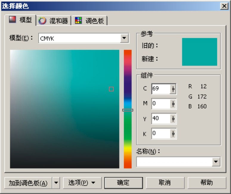 4 选择新绘制的正圆,在状态栏上双击“轮廓颜色”显示窗,打开“轮廓笔”对话框,如图2-3所示。单击“颜色”下拉按钮,在弹出的颜色调板中单击“其他”按钮,打开“选择颜色”对话框。将颜色设置为绿色(C:87、M:35、Y:60、K:2),其他参数使用默认设置,单击“确定”按钮,退出该对话框。